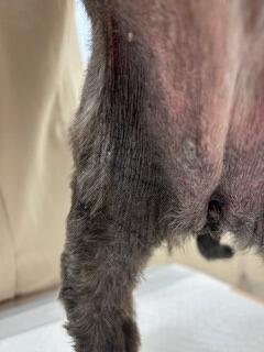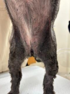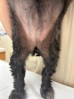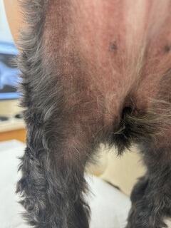 食物アレルギー食を与えたり、かゆみ止め作用が強いゼンレリアを与えていても内股の症状が改善しないため、セカンドオピニオンで当院を受診されました。