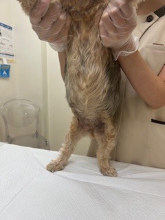 腹部全体に広がっていた膿皮症に関しては、膿皮症に対して効果のある薬用シャンプーを使用しまた。