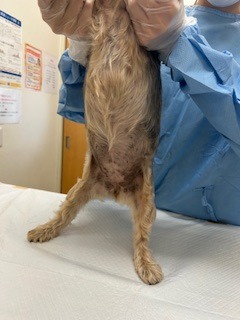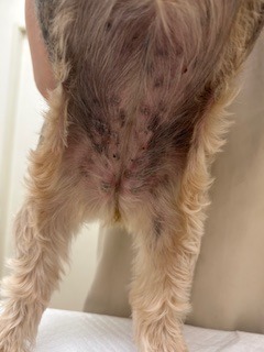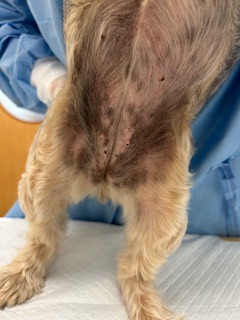 膿皮症に関しては、当初は抗生剤の内服で症状が一旦改善していたようですが、「膿皮症」が繰り返すたびに抗生剤の内服を開始して、効果がないと判断した場合には、薬剤感受性試験を実施して、その結果に合わせて抗生剤を変更されていました。ただ、その抗生剤も当初は効果があったようですが、そのうち続けているうちにぶり返して、改善が認められず、背中にも広がってきているため、当院にセカンドオピニオンでご来院されました。