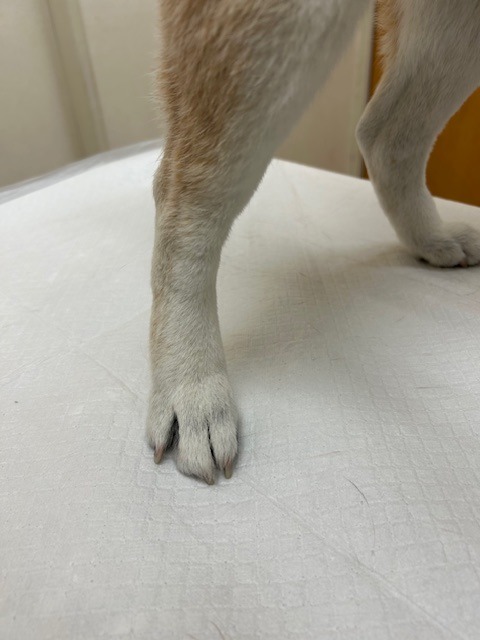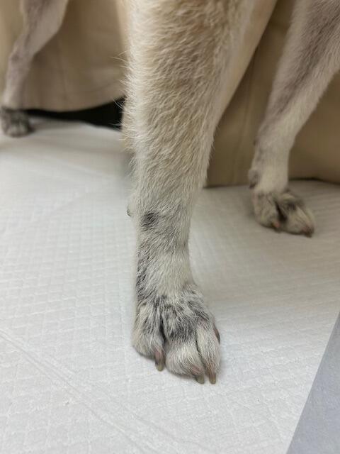 このワンちゃんは、薬用シャンプーで洗って、プレドニゾロン(ステロイド)を投薬して、少しだけ痒みが軽減するものの、エリザベスカラーを装着していても、足先も痒がっている状態でした。