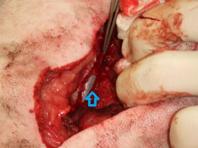 MRI検査で確認した通り、神経が椎間板物質によって圧迫を強く受けていました。青い矢印は、椎間板物質を取り除いたことで元の正常な形状に戻った神経です。
